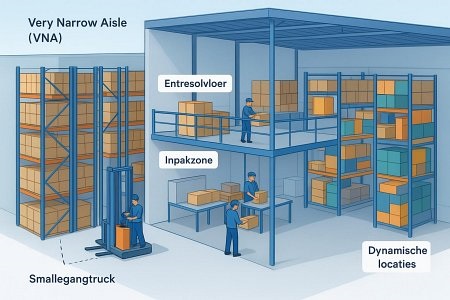 Met hogere stellingen en smalle gangpaden (Very Narrow Aisle, VNA) kan de opslagcapaciteit met 15% tot 40% stijgen zonder nieuwbouw of verhuizing. Een entresolvloer (mezzanine) voegt een extra werkniveau toe voor lichte goederen of een verzamelzone en kan het bruikbare vloeroppervlak effectief verdubbelen. Dynamische locatie-indeling — waarbij producten niet op een vaste plek staan maar naar de eerstbeschikbare positie gaan die past bij de afmetingen — voorkomt lege plekken wanneer een artikel tijdelijk niet op voorraad is.